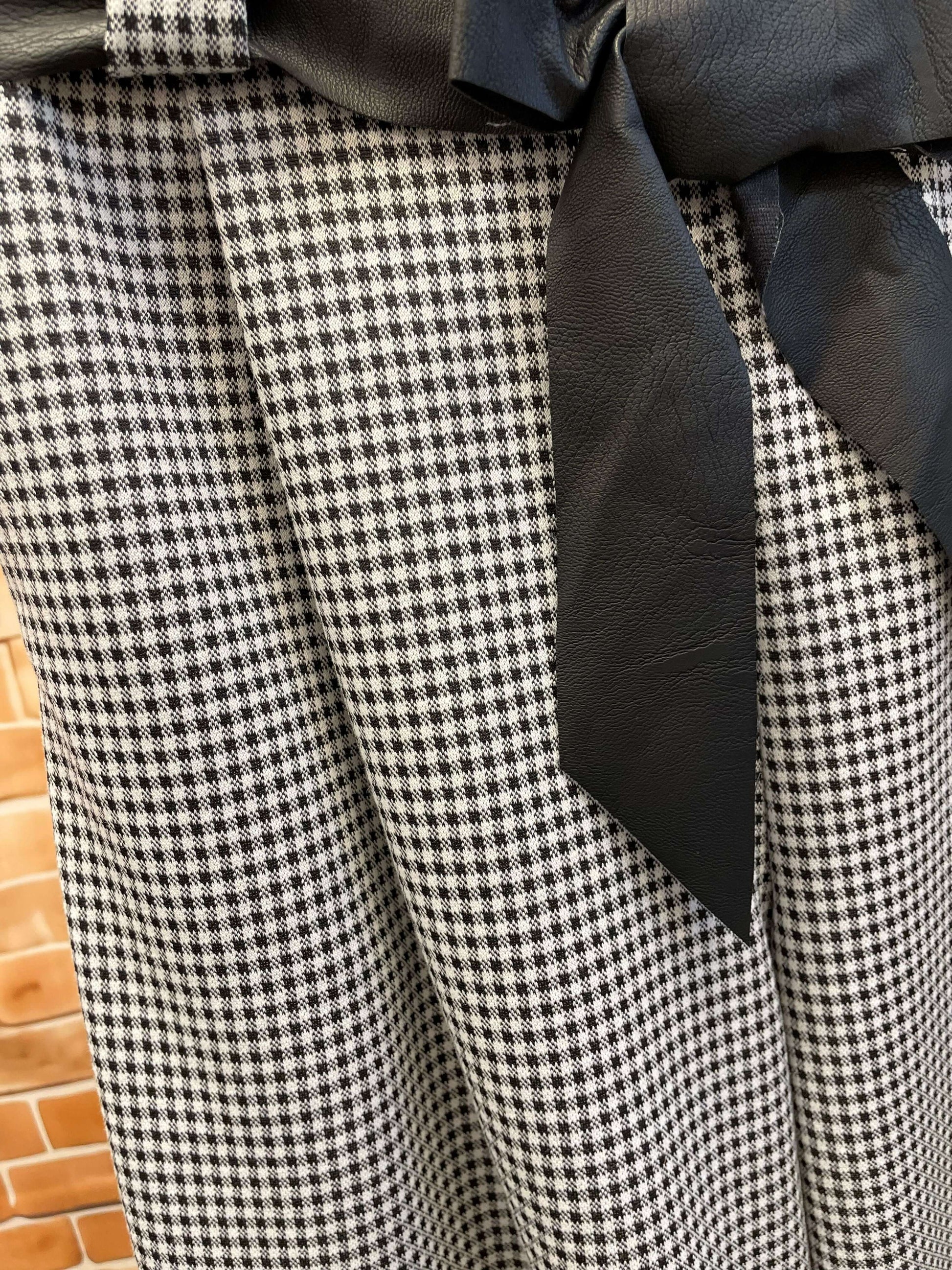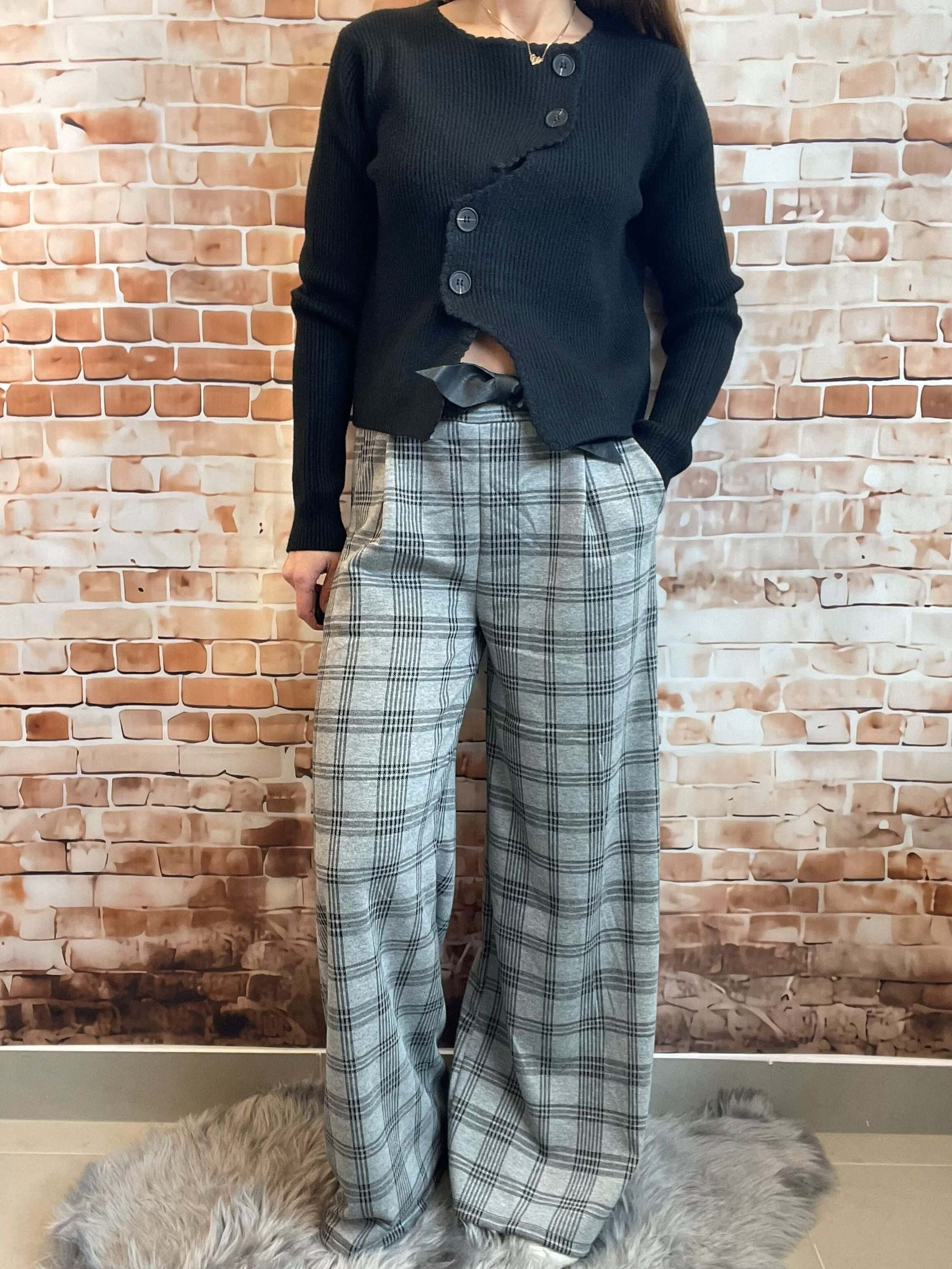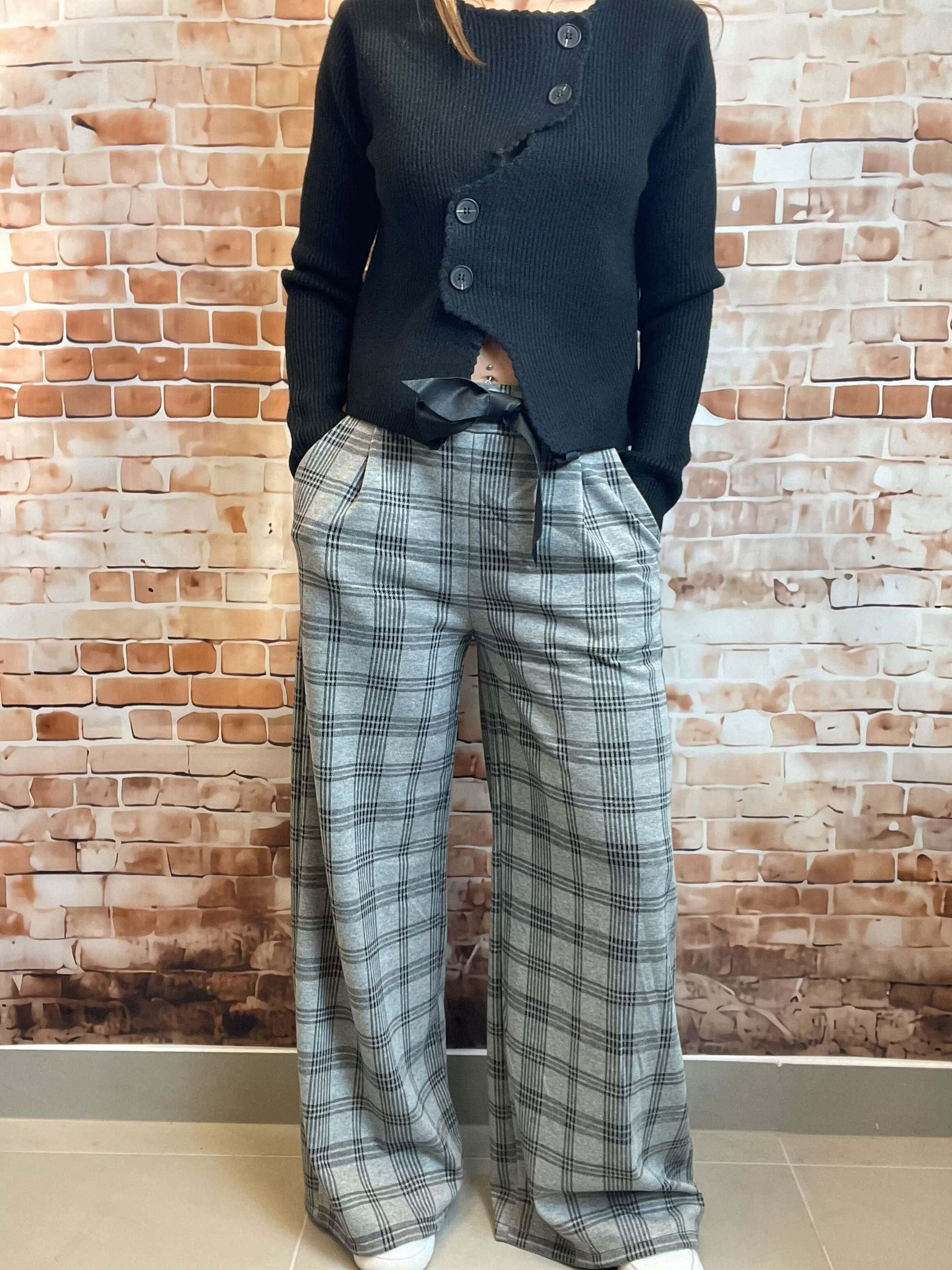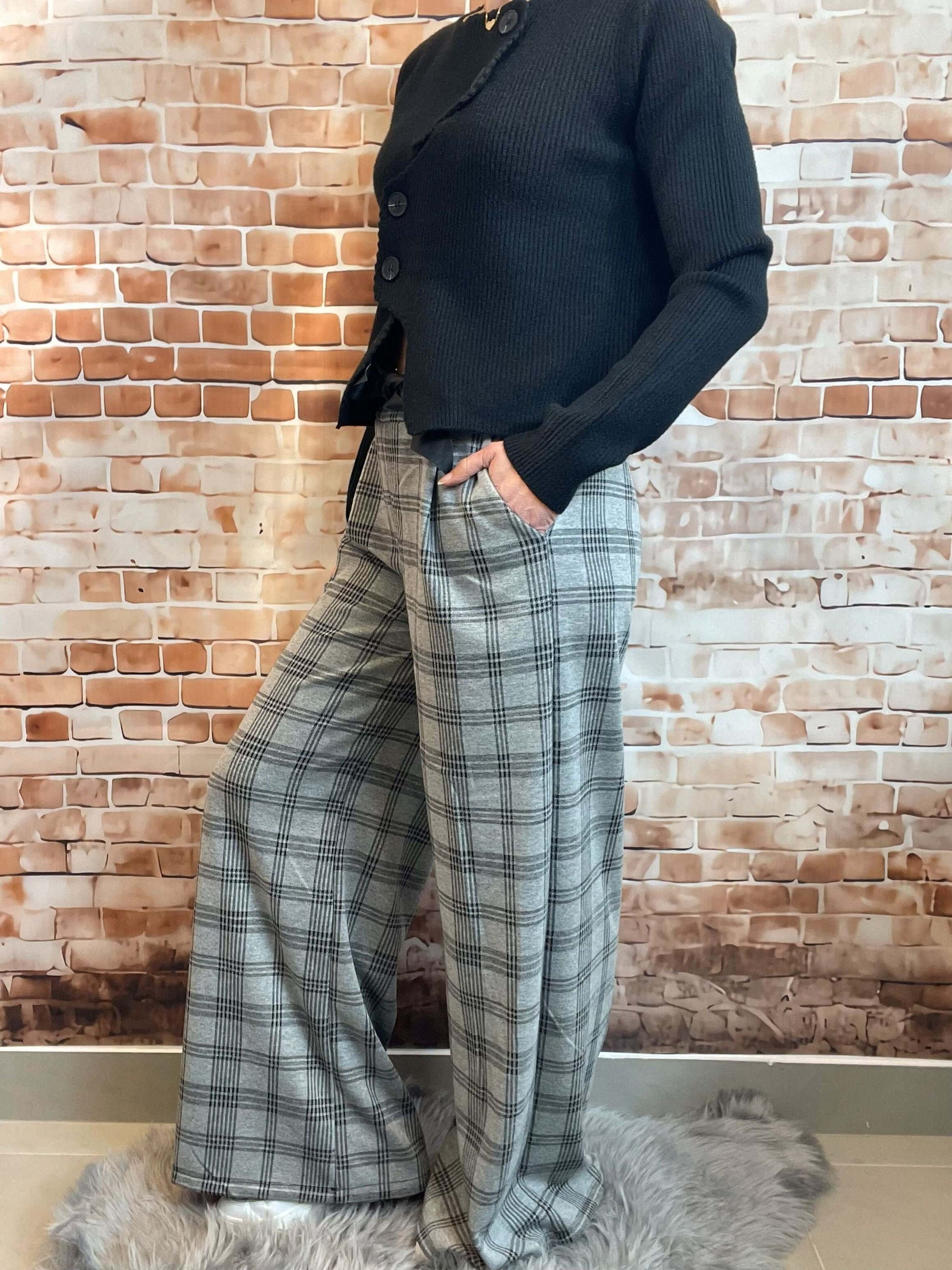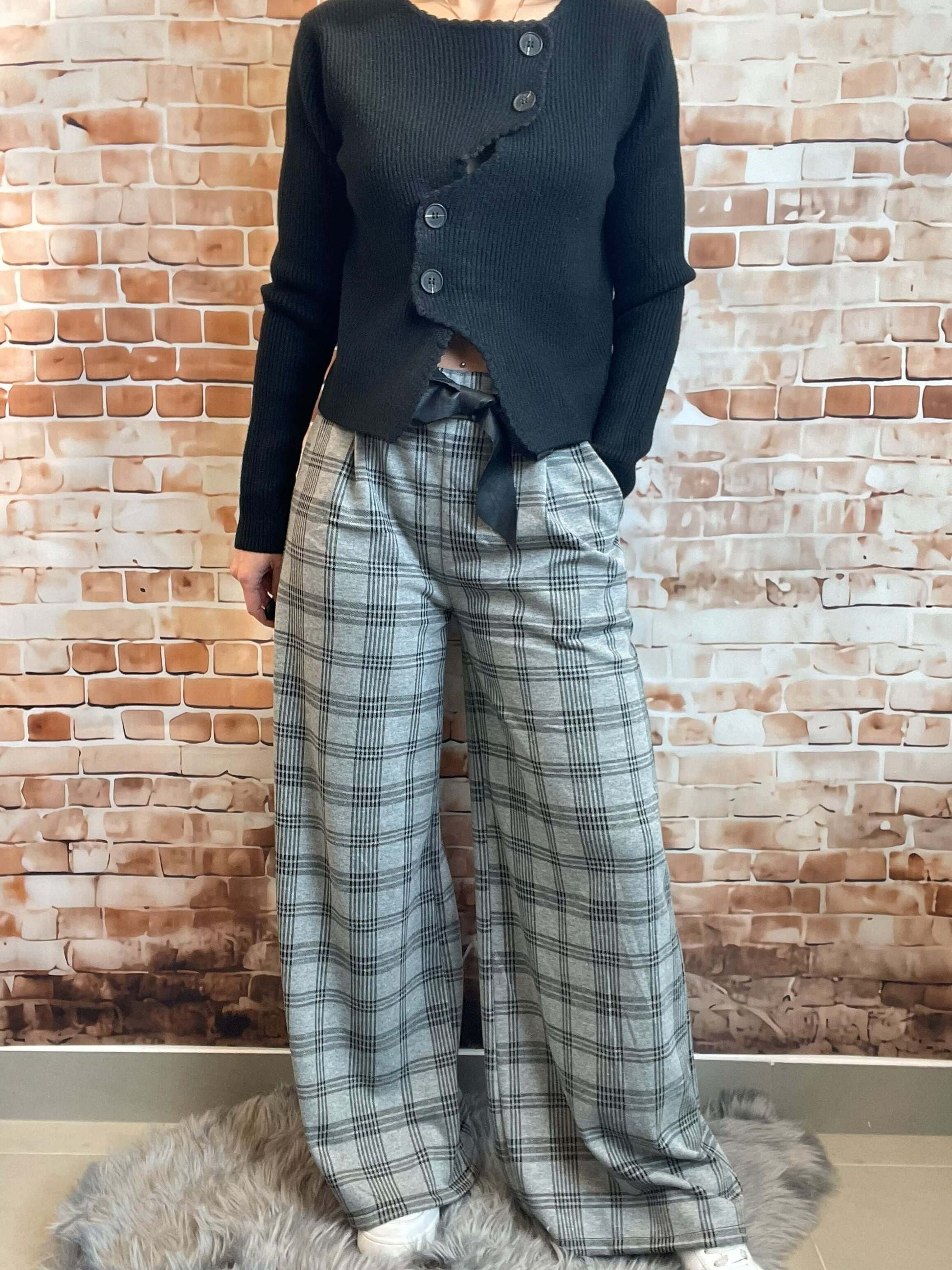 Grau-Schwarz gemusterte Stoffhose - Weites Bein