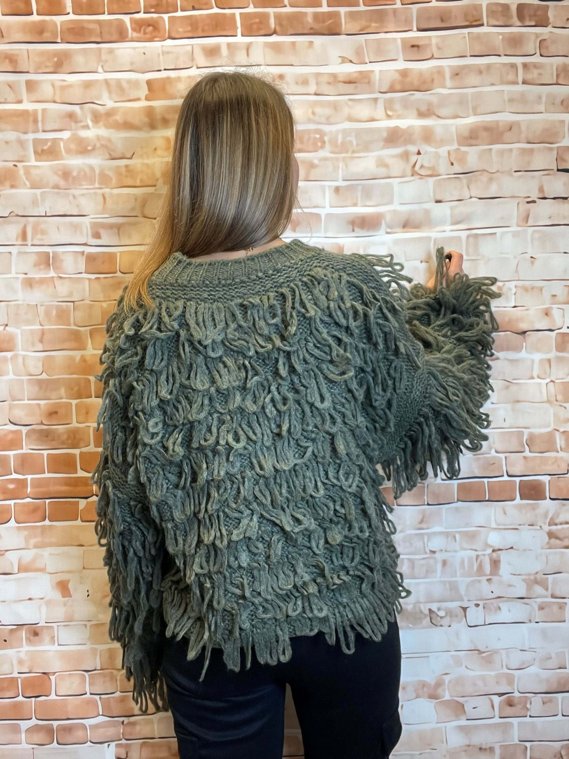 Dieser zottelige olivgrüne Pullover ist ein absoluter Hingucker! Der Oversize-Schnitt verleiht ihm eine lässige Note und der zottelige Stoff sorgt für ein kuscheliges Tragegefühl. Perfekt für kalte Tage oder gemütliche Abende zuhause. Holen Sie sich den ultimativen Wohlfühlfaktor mit diesem trendigen Pullover!